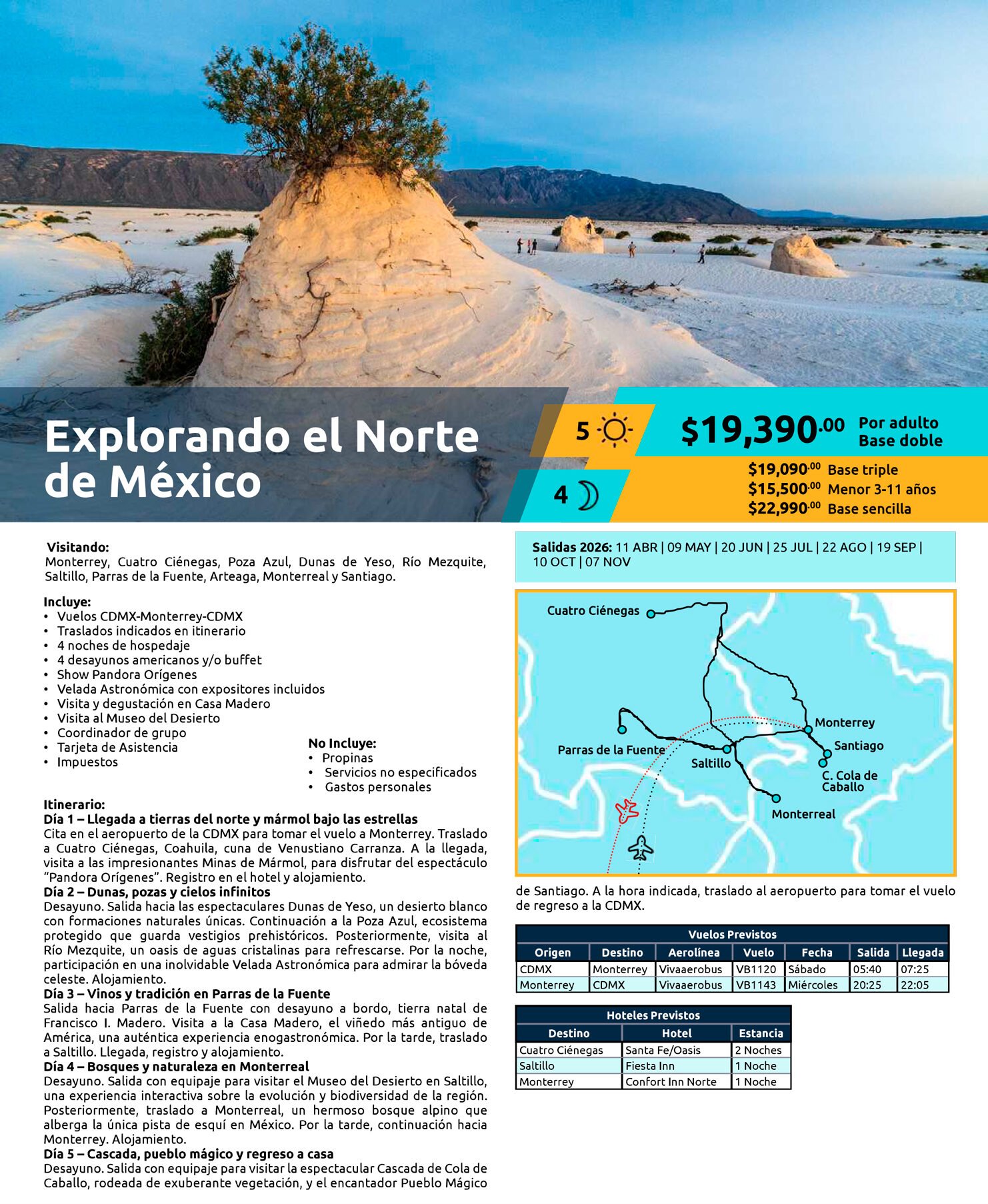 - Día 1 – Monterrey y Oasis en Cuatro Ciénegas: Vuelo CDMX a Monterrey. Traslado a Cuatro Ciénegas. Visita a las Minas de Mármol y al Río Mezquite. Velada Astronómica. Alojamiento.